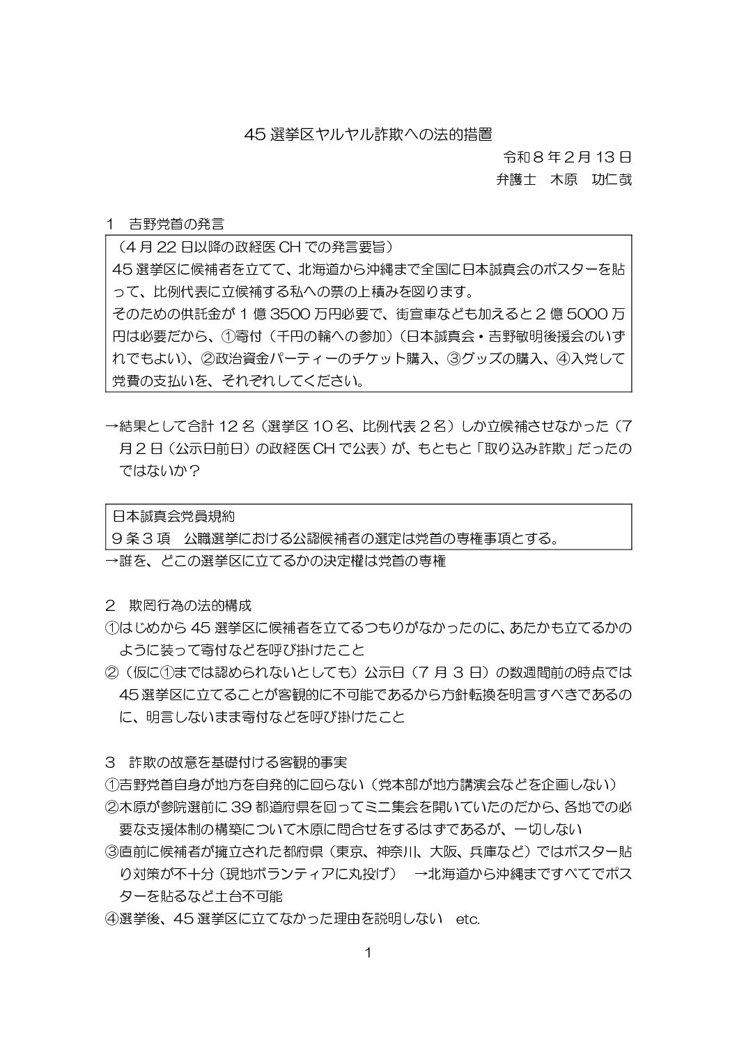 45選挙区ヤルヤル詐欺の法的措置(R8.2.13)